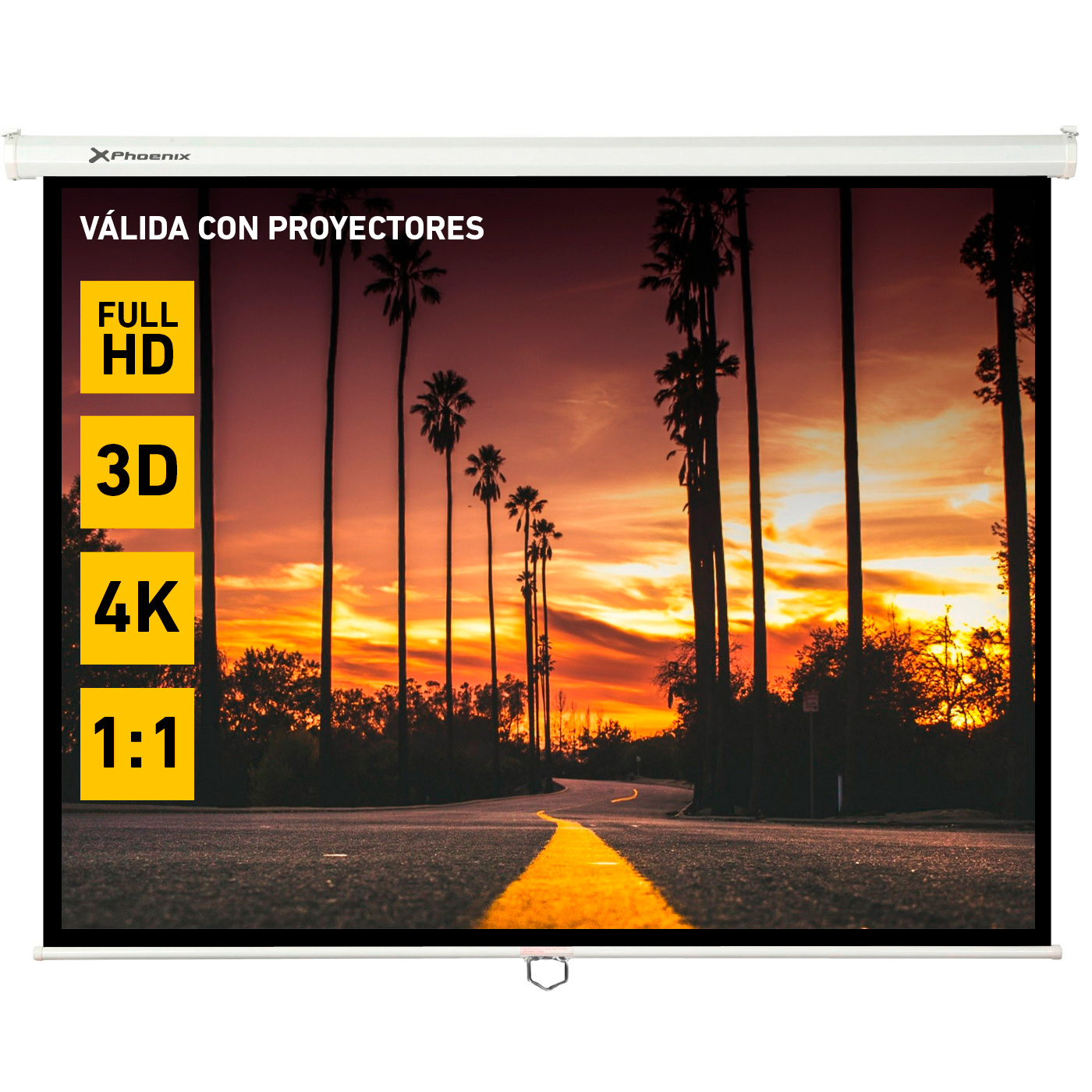 Características principales: Incluye cordón con anilla para desplegar y retraer la pantalla. Adapta tu pantalla a diferentes formatos de proyección. El diseño de la caja permite instalar la pantalla en el techo o en la pared.