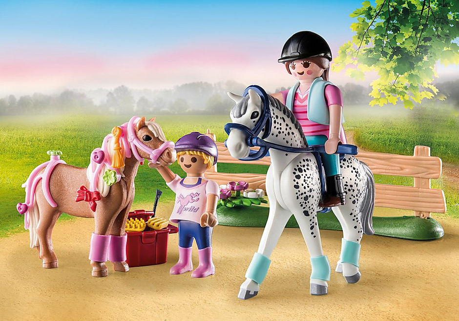 Los aficionados a la equitacin estarn encantados con el Starter Pack Cuidado de Caballos de PLAYMOBIL. El set contiene todo lo que los amantes de los caballos necesitan para que su poni luzca bonito. Adems de lazos y cintas, la crin y la cola pueden adornarse con flores y corazones. Tras arreglar al poni, los dos jinetes salen a pasear con sus animales. Un colorido set para los amantes de los animales a partir de 4 aos. El set incluye dos figuras PLAYMOBIL, un poni, un caballo, vendas, fusta, cabestro, brida y otros extras para el cuidado del caballo. Los cascos se pueden quitar de las figuras.Los Starter Packs son la perfecta introduccin al juego imaginativo y al centro del universo PLAYMOBIL. Los sets contienen figuras de juego y accesorios para las diferentes lneas de PLAYMOBIL, son rpidos de montar y estn listos para jugar de inmediato.